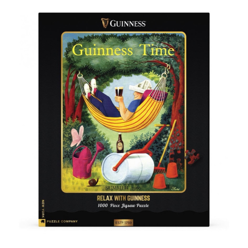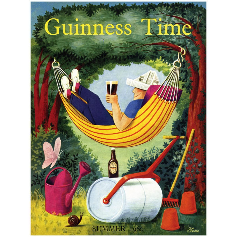 C'est l'heure de la Guinness dans un hamac de jardin. Avec un chapeau en papier à la mode sur la tête et une pinte à la main, notre jardinier Summertime est tout sourire en plein repos !