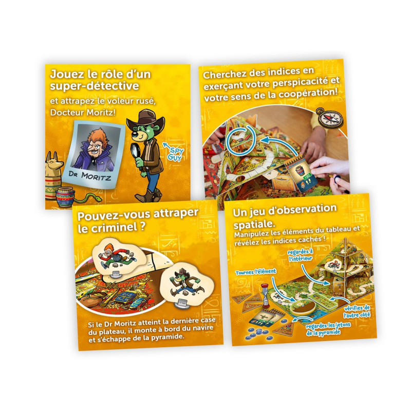 Dans Spy Guy - Pyramide, le docteur Moritz a volé la carte menant au trésor de Treflhotep IV ! En équipe, aidez Spy Guy à explorer une pyramide en 3D pleine de pièges et de surprises : certains éléments du plateau bougent et font apparaître ou disparaître des indices selon le tour.
