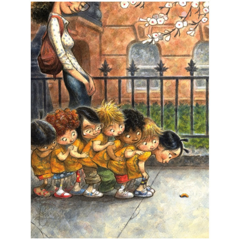 Une file d'enfants observe avec curiosité un petit ver, qui se déplace centimètre par centimètre sur le trottoir.