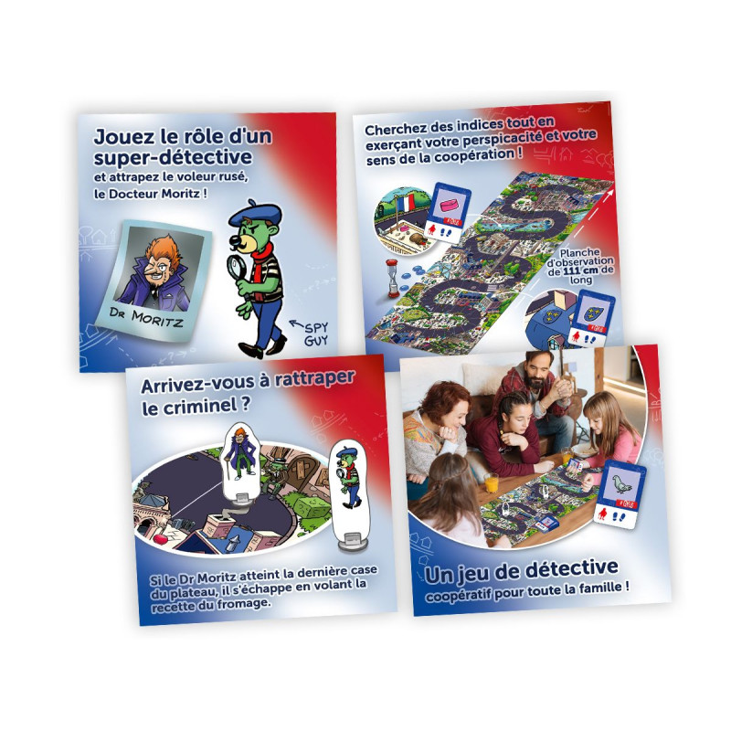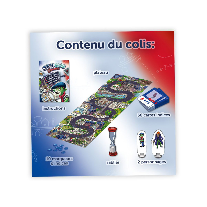 Avec Spy Guy - France, embarquez pour une enquête coopérative pleine de rebondissements à travers l’Hexagone ! Le célèbre détective a besoin de votre aide pour retrouver le voleur qui a dérobé le secret du meilleur fromage français avant qu’il ne s’échappe. Ensemble, observez le grand plateau richement illustré de monuments et de symboles français, repérez les objets cachés et faites avancer Spy Guy dans sa poursuite.