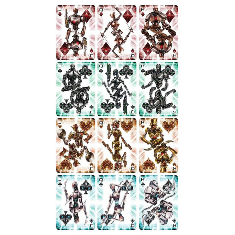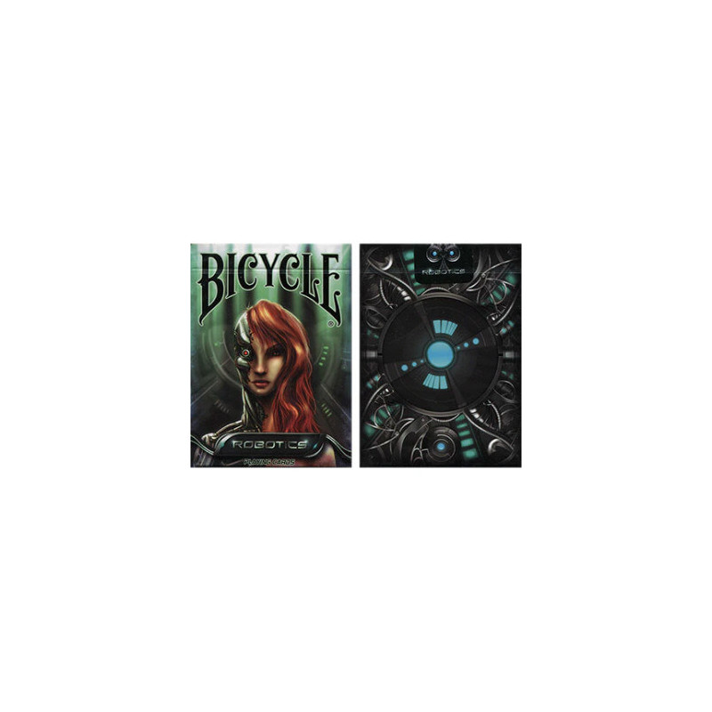 Paquet de 54 cartes Bicycle, une référence dans les cartes de magicien. Ce paquet explore le thème des robots, que ce soit dans des univers cyberpunk, SF ou steampunk.