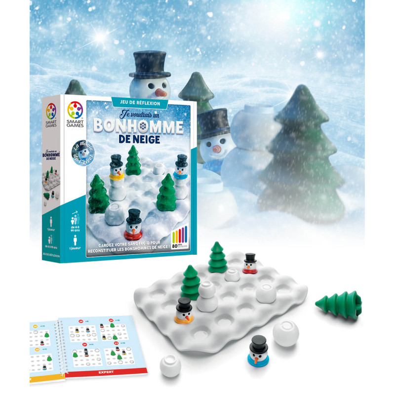 C’est l’hiver et la neige tombe à gros flocons… Chouette ! Vous allez construire des bonshommes de neige à l’aide des boules amassées et des têtes aux chapeaux et nez de carotte. « Je voudrais un bonhomme de neige » est un jeu de déplacement indirect de pièces mobiles vous proposant de planifier les mouvements afin de reconstituer tous les bonshommes de neige. Bougez les pièces, rebondissez contre les obstacles et empilez les trois éléments de chaque bonhomme afin de résoudre les quatre-vingt défis du plus simple au plus ardu avec ou sans gants.