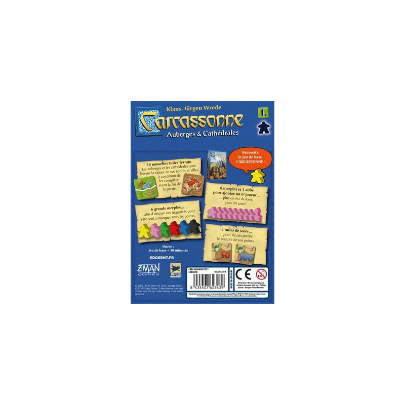 Auberges et Cathédrales, première extension pour Carcassonne, ajoute de nombreuses tuiles permettant d’étendre considérablement le jeu et propose également des tuiles spéciales, dont les cathédrales, qui peuvent augmenter la valeur des villes... à condition de les achever avant la fin de la partie !