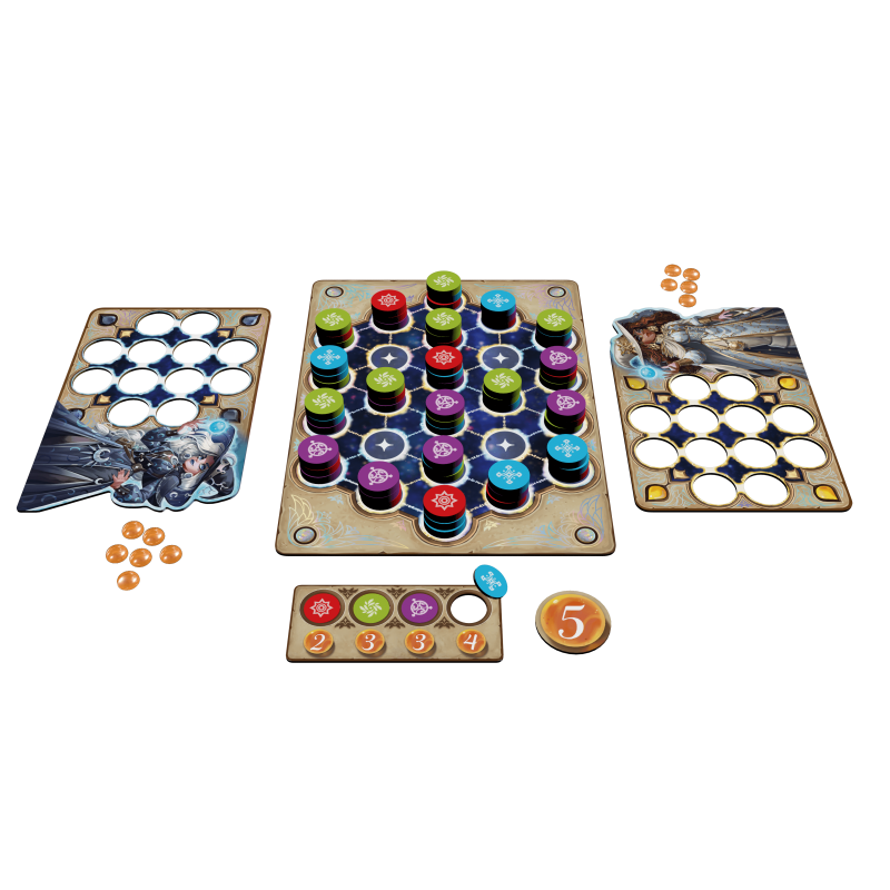 Pour y parvenir, les joueurs vont déplacer des piles de jetons sur le plateau central en utilisant leur énergie pour former des triangles de même couleur. Alors, ils pourront récupérer un jeton pour le placer astucieusement sur leur plateau Magicienne.