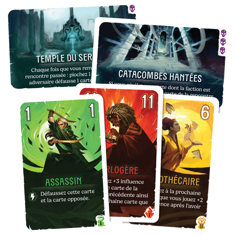 Dans votre deck et celui de votre adversaire, exactement les mêmes cartes : 16 personnages disposant d'une influence allant de 1 à 16 et de pouvoirs liés à leur faction. La Rebellion (vert) appauvrit le jeu de votre adversaire en lui faisant défausser des cartes de sa main ou de son deck. La Dynastie (bleu) vous donne (ou vous rend) l'avantage en manipulant l'issue des combats. L'Académie (jaune) use de magie pour transformer les éléments en présence, mais aussi ceux des duels passés et futurs. Enfin la Guilde (rouge) booste ou réduit l'influence de vos personnages pour inverser l'issue d'un combat.