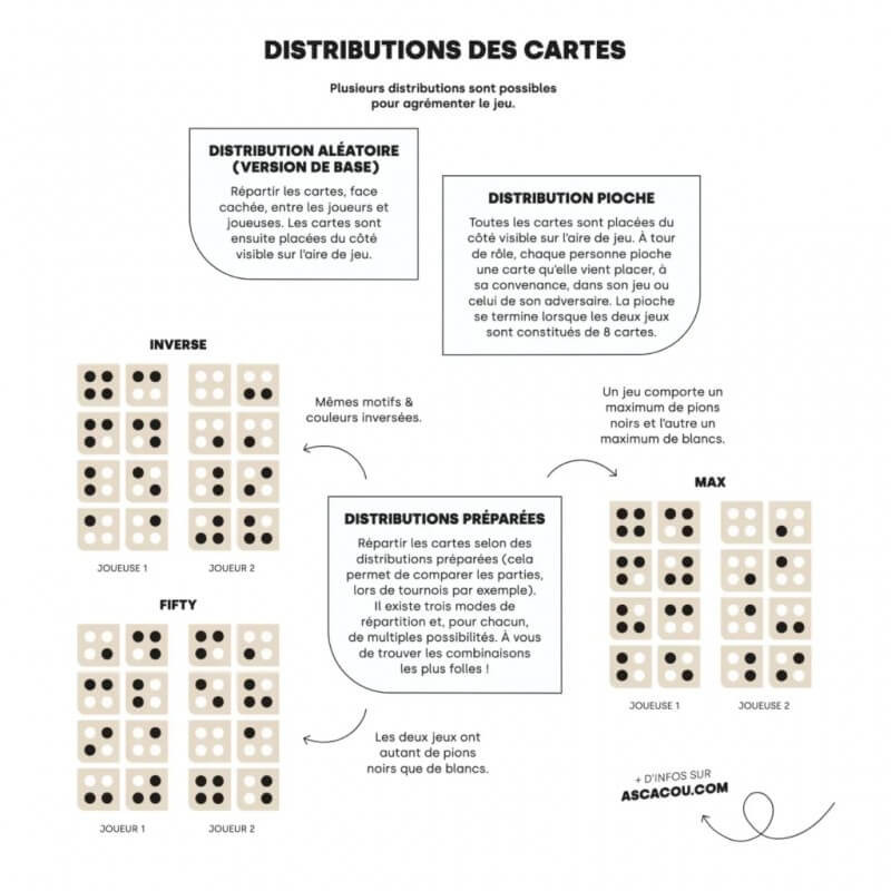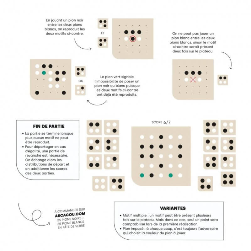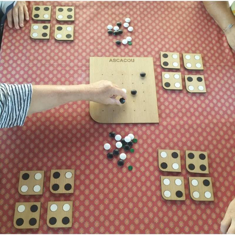 Une boite de jeu ASCACOU contient un livret complet des règles et variantes, y compris une page en anglais. Il y a les éléments pour jouer : un plateau de 25 emplacements régulièrement espacés et comportant un angle arrondi, les 16 cartes-motif différentes avec un angle arrondi également, et une petite boite contenant 25 pions bicolores (Noir d’un côté et Blanc de l’autre), ainsi que 7 pions verts (et quelques pions supplémentaires en cas de perte).