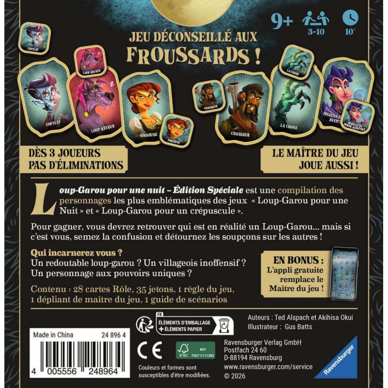 L'application gratuite remplace le Maître du jeu et vous plonge dans l'ambiance avec une narration immersive. Changez de rôle à chaque partie en alternant les 28 personnages de ce best-of pour une rejouabilité infinie. Bluffez, enquêtez, accusez : chaque nuit réserve son lot de surprises et de retournements. Le coffret inclut 28 cartes Rôle, 35 jetons, la règle du jeu, un dépliant de Maître du jeu et un guide de scénarios pour varier les plaisirs. Accessible dès 9 ans, ce jeu de rôles vous réserve des soirées mémorables remplies de rires, de suspense et de trahisons ! Saurez-vous survivre à la nuit ?
