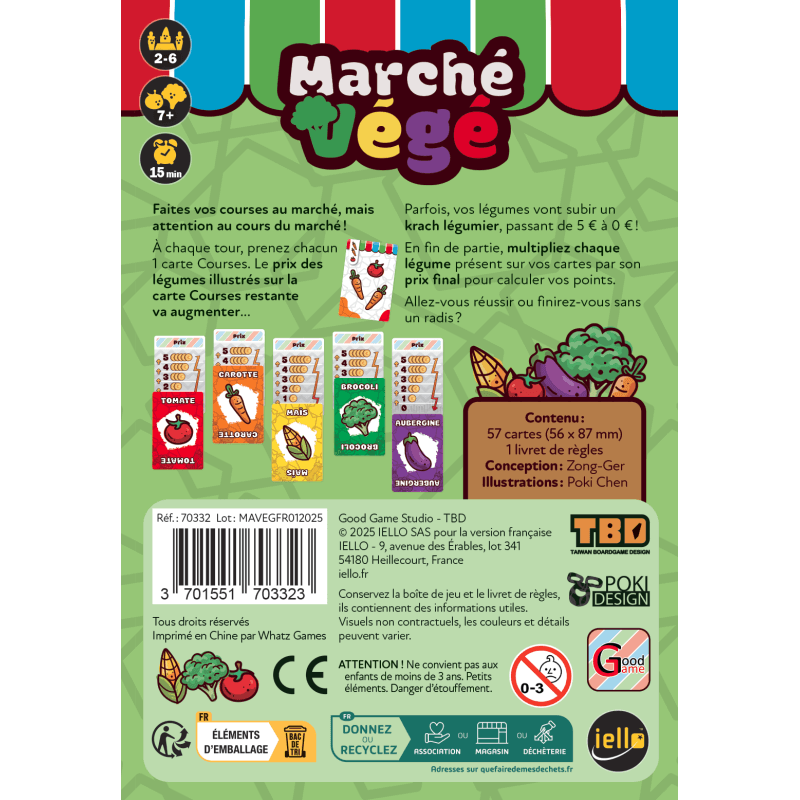Accessible dès 7 ans, Marché Végé est un jeu familial, fun et malin ! Il permet à toute la famille de s’amuser pour des parties d’une quinzaine de minutes.