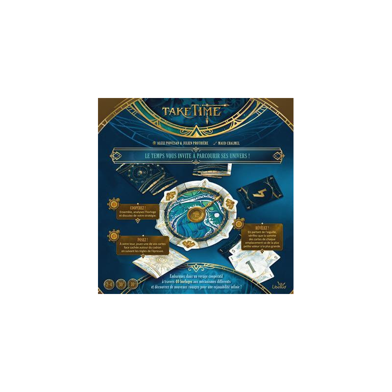 Dans Take Time, vous affrontez 40 horloges énigmatiques en équipe. Ouvrez l’une des enveloppes, retournez la première horloge, puis mélangez les 12 cartes Lune et les 12 cartes Soleil (numérotées de même manière) avant de les distribuer entre les joueurs. Attention, personne ne regarde ses cartes pour l’instant.