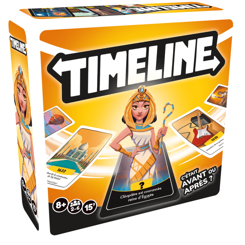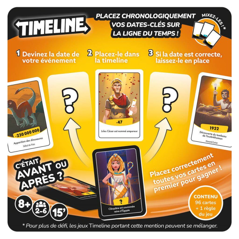 Timeline se joue avec des cartes illustrant des événements historiques. La face noire n’indique pas la date, qui est par contre visible sur la face blanche. Chacun reçoit 4 cartes, côté noir, en début de partie. Une autre carte Événement est tirée de la pioche et posée face date visible au centre de la table. Le but du jeu est d’être le premier joueur à ne plus en avoir.
