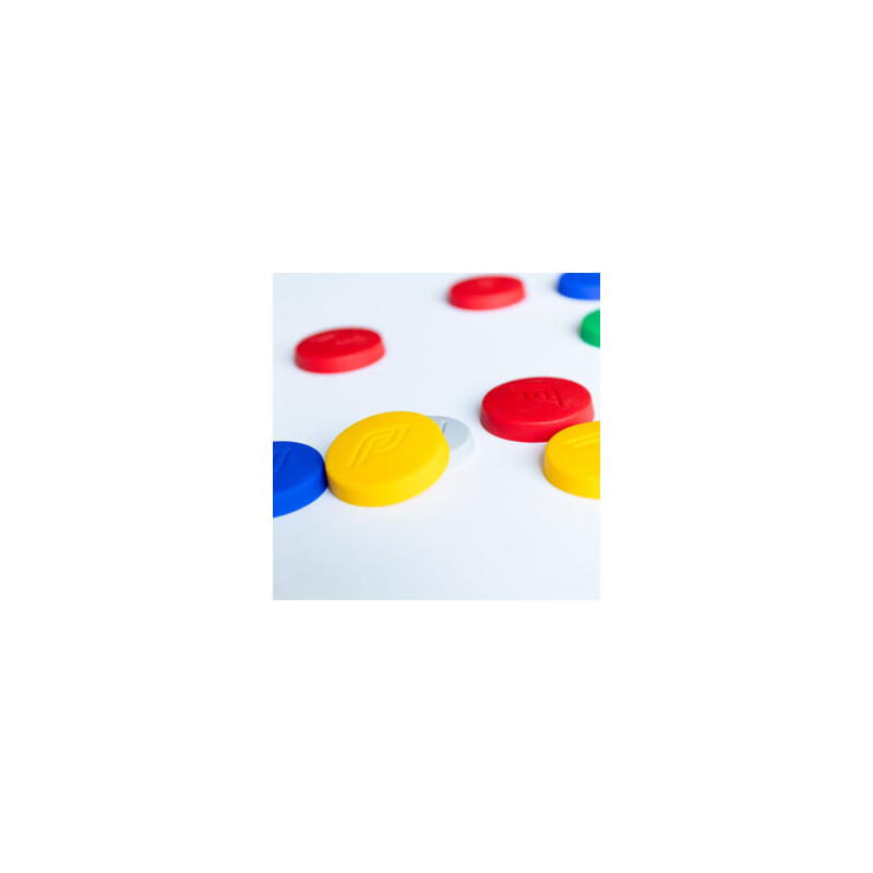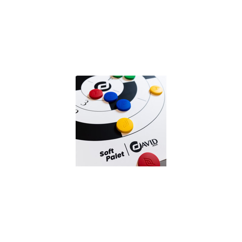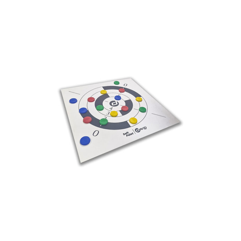 Contenu de la boîte : 16 palets colorés (4 rouges, 4 bleus, 4 verts, 4 jaunes), 2 maîtres et 1 tapis en silicone réversible.
