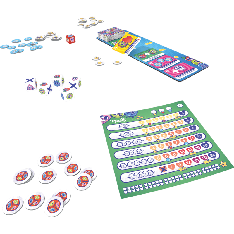 Miams est un jeu de dés survitaminé pour toute la famille dès 10 ans. Lancez vos dés, composez des combinaisons de fruits (paire, brelan, full, carré, suite ou miams), puis cochez les cases de votre feuille pour marquer des points et des bonus. Le but : avoir coché 50 cœurs avant vos adversaires et marquer le maximum de points !