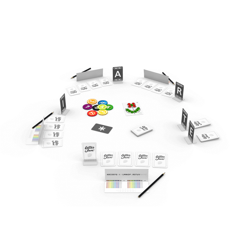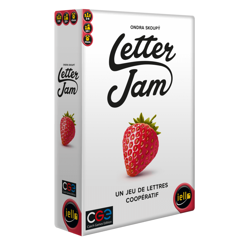 Un jeu de lettres très original ! Letter Jam mixe avec bonheur déduction et manipulation des lettres pour former un cocktail savoureux. Il faut en effet parvenir à trouver des mots qui vont permettre de donner le maximum d’indices aux coéquipiers, et donc qui impliquent le maximum de joueurs possible, afin que chacun puisse identifier les lettres qui lui permettront ensuite de former un mot. Inventivité, intuition et déduction seront donc de rigueur pour ce jeu aussi amusant qu’astucieux. Les joueurs seront heureux de deviner, de faire deviner, mais aussi de trouver des mots au moyen de leurs lettres cachées et (peut-être !) identifiées… Intense et fun : découvrez le plaisir du jeu de lettres d’une manière totalement inédite !