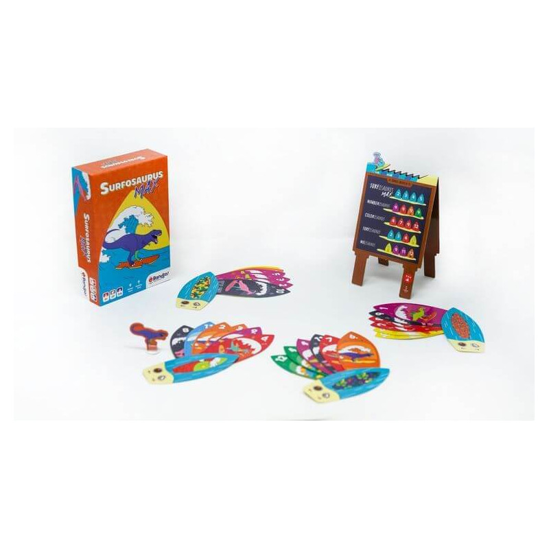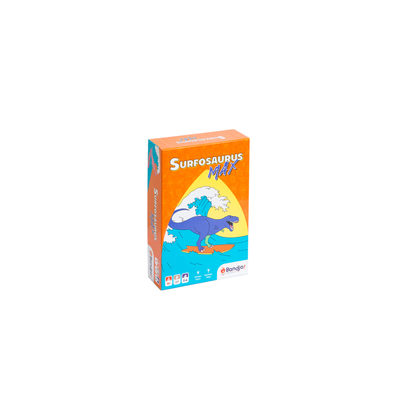Surfosaurus Max est un jeu semi-coopératif avec 7 séries de dinos numérotés de 1 à 12. Lors d’une manche, les joueurs posent juste 2 ou 3 cartes devant eux, en tentant de sentir l’alliance la plus prometteuse ... car à la fin, seules les cartes qui forment la meilleure combinaison de 4 ou 5 cartes seront gagnées ! Suspense garanti !