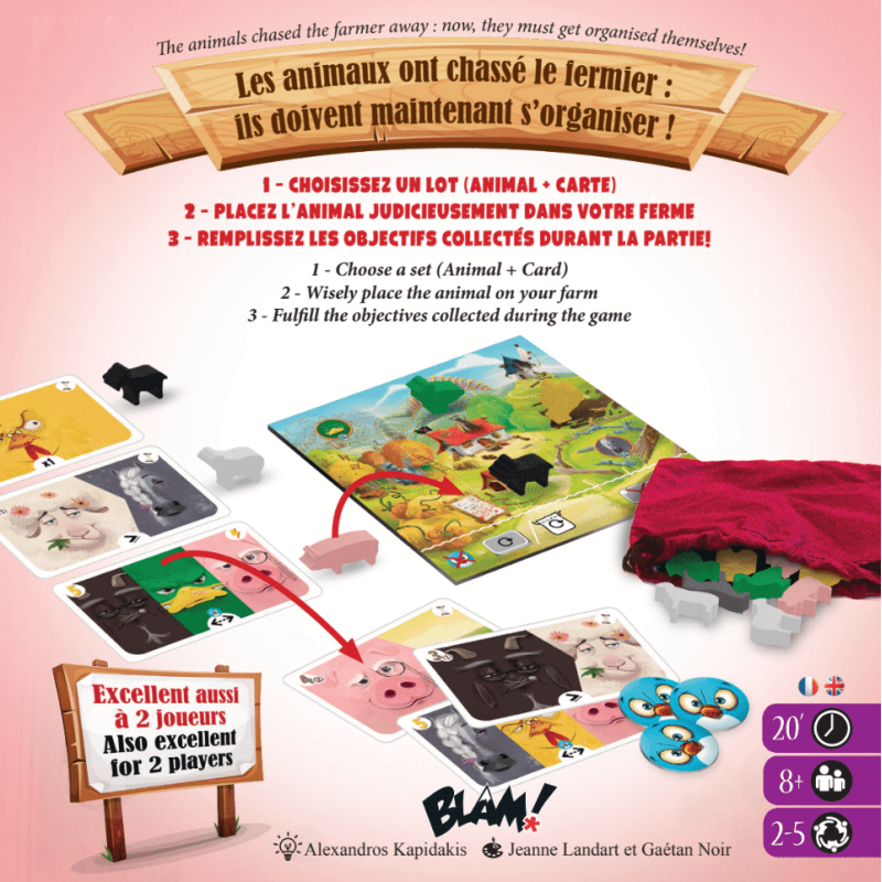 A quel endroit le placer dans sa ferme ? Quel nouvel objectif semble réalisable ? Avec seulement 9 tours de jeu, Farm Club se révèle rapide et demande en permanence du discernement : chaque animal, objectif ou placement influe sur le score final et il convient d’utiliser à bon escient les 2 actions spéciales qui permettent de réorganiser sa ferme ou de renouveler l’offre d’animaux et d’objectifs. Farm Club séduit par son thème amusant, sa richesse stratégique malgré sa simplicité d'accès et le plaisir de manipuler les pions animaux en bois !