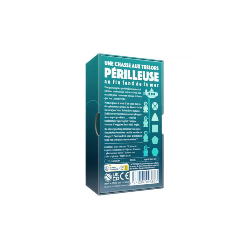 Plongez au plus profond des océans ! Utilisez trois dés et votre turbo à bon escient pour remonter plus de trésors que vos concurrents. Prenez place à bord d'un sous-marin d'explorateurs avides de découvrir les trésors jonchant le fond des océans. Enfilez votre combinaison de plongée mais soyez prudents… tous les explorateurs partagent l'unique réserve d'oxygène de ce vieil engin ! Ne soyez pas trop téméraire ou vous risqueriez de mettre tout le monde en danger !
