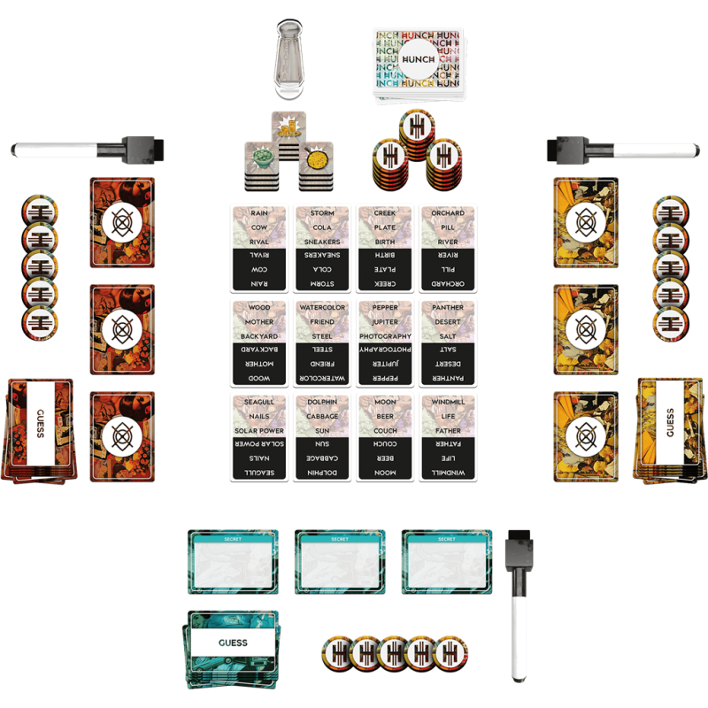 Dans Hunch, tout tourne autour des mots ! Chaque joueur choisit secrètement, sur les cartes qu’il a reçues, les mots qu’il doit faire deviner. Ensuite il invente deux indices. Les indices sont ensuite vendus aux enchères aux autres joueurs ! A partir des indices acquis par chacun, retrouvez les mots de chaque joueur.