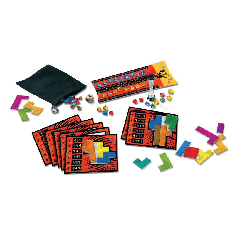 Dans Ubongo , les joueurs s’affrontent pour résoudre des énigmes individuelles le plus rapidement possible afin d’obtenir les premières pierres précieuses à portée de main.