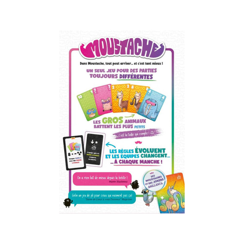 Moustache est un jeu de plis à rebondissements, pour 3 à 6 joueurs. À chaque manche, les équipes sont redéfinies aléatoirement et une nouvelle règle vient chambouler la partie : hiérarchie des couleurs inversée, jokers délirants, effets de cartes ... Rien n’est jamais figé ! Grâce à un système de règles évolutives et de cartes Équipe, chaque partie est unique et pousse à l’adaptation constante.