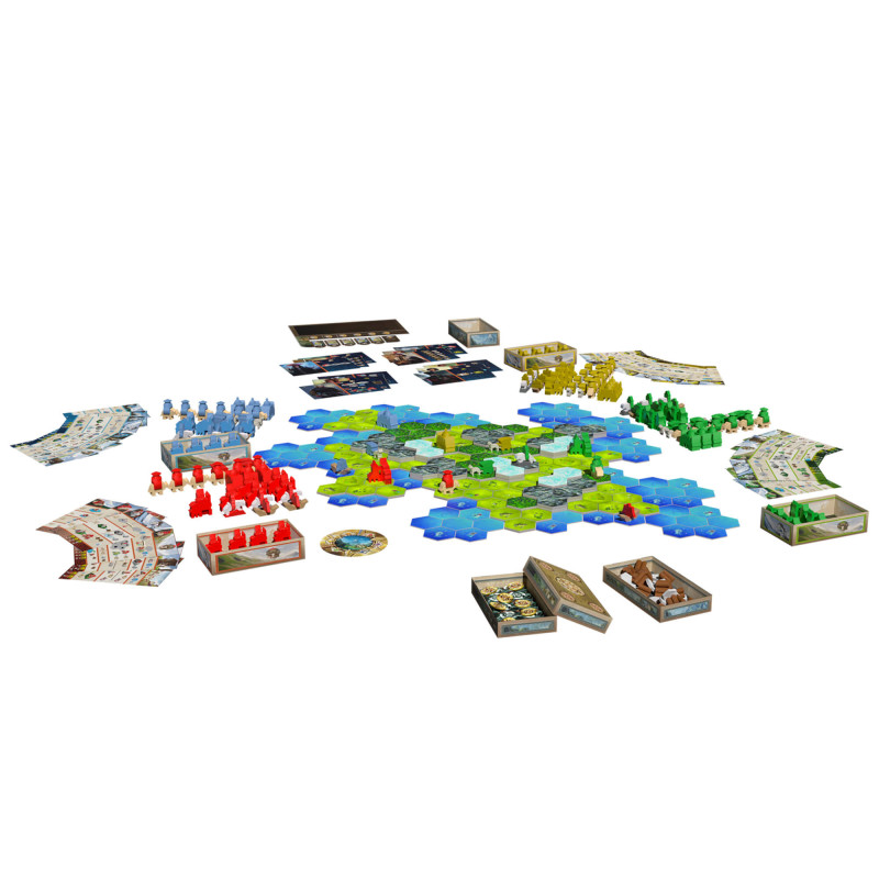 Chaque joueur commence avec un petit peuple comprenant une Ville, un Nomade et un Navire, et évolue vers une civilisation complète avec des Temples, des Marchands et les précieux Montagnards, capables de franchir ces falaises impressionnantes.