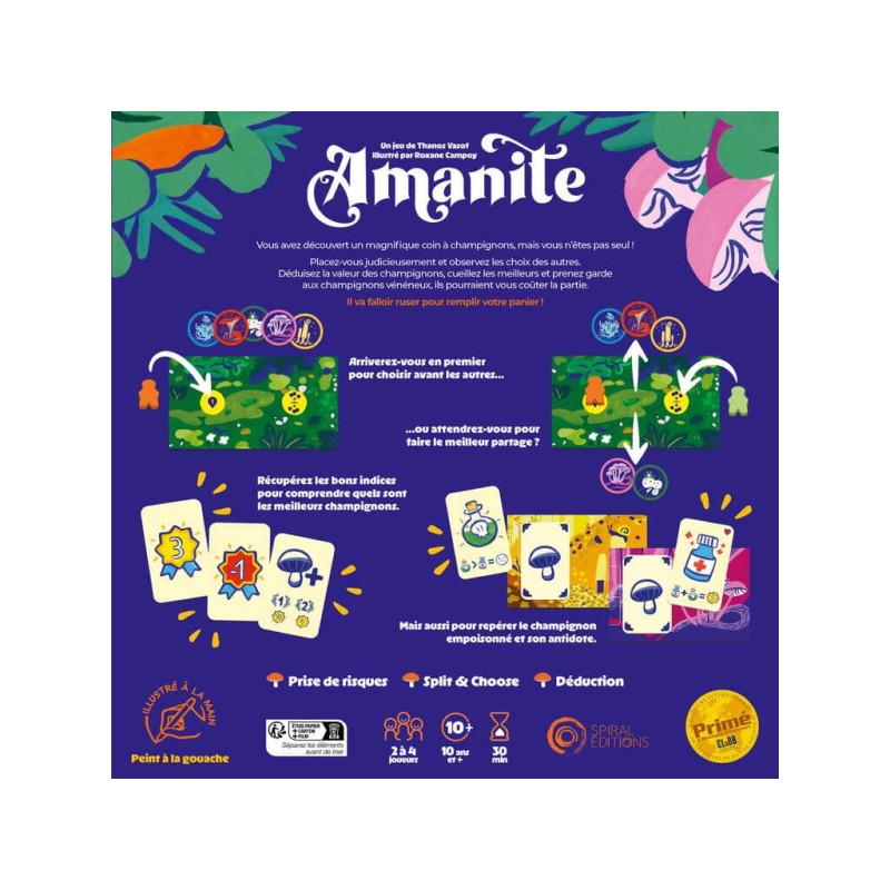 Dans Amanite, tout sera question de déduction et de prise de risque. Faites de meilleurs choix que vos adversaires en ramassant les bons champignons (et en évitant les moins bons !) Les informations que vous choisirez seront précieuses et les choix des autres joueurs vous en apprendront beaucoup !