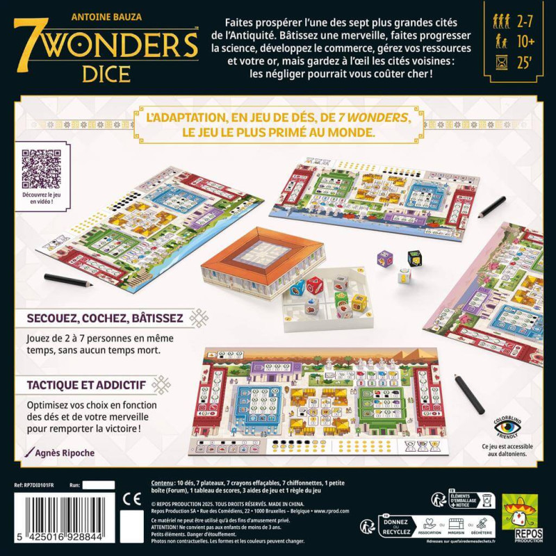 Dans 7 Wonders Dice, retrouvez l'univers emblématique du jeu le plus primé au monde dans un roll & write. Faites prospérer l’une des sept plus grandes cités du monde antique. Construisez votre merveille, faites progresser la science, concentrez-vous sur le commerce ou renforcez votre puissance militaire. Sans oublier de gérer votre budget ! À chaque tour, choisissez avec soin un dé dans la boîte Forum pour choisir l'axe de développement que vous souhaitez privilégier. Tous les joueurs agissent en simultané, avec les mêmes opportunités, c’est donc votre stratégie qui fera la différence.