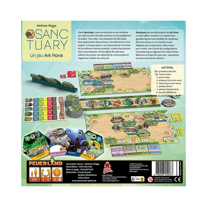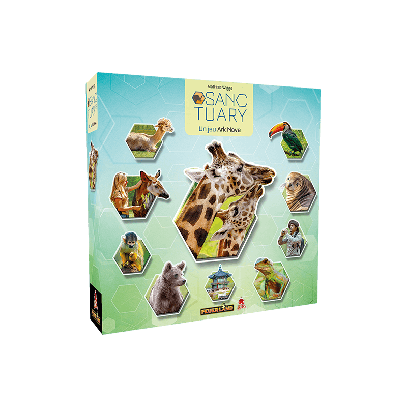 Dans Sanctuary, vous construisez un zoo moderne qui veille au bien-être des animaux et à la satisfaction du public. Pour cela, vous disposez de 135 tuiles Zoo représentant des animaux, des bâtiments et des projets.