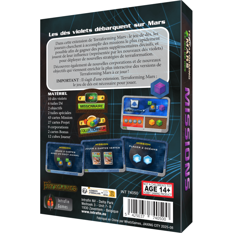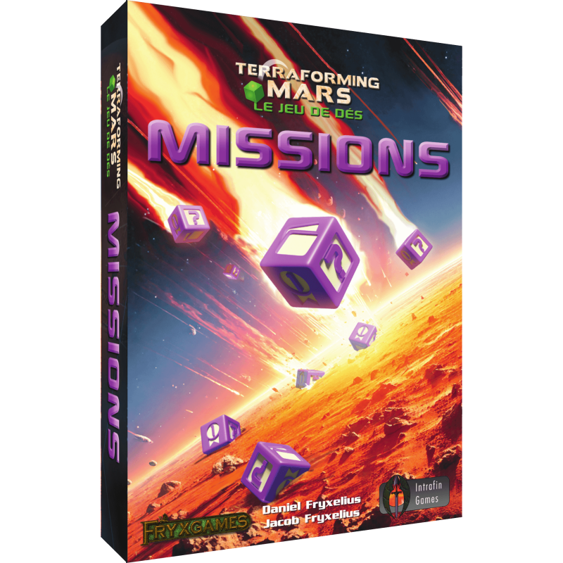 Dans cette extension de Terraforming Mars : le jeu de dés, les joueurs cherchent à accomplir des missions le plus rapidement possible afin de gagner des points supplémentaires décisifs, et jouent de leur influence (representée par les nouveaux dés violets) pour déployer de nouvelles stratégies de terraformation.