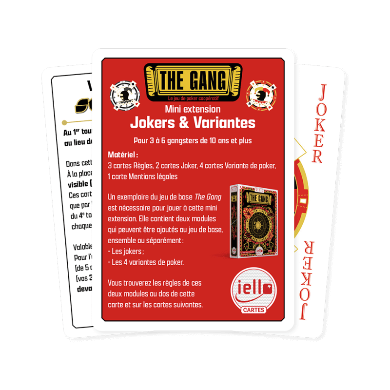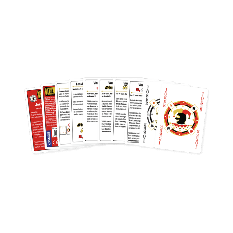 Vous trouverez les règles de ces deux modules à l'intérieur du paquet qui est composé de 10 cartes (3 cartes Règles, 2 cartes Joker, 4 cartes Variantes de poker, 1 carte Mentions légales).