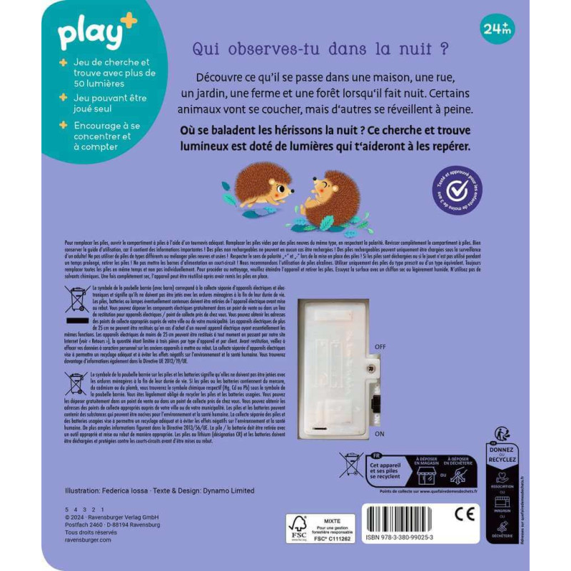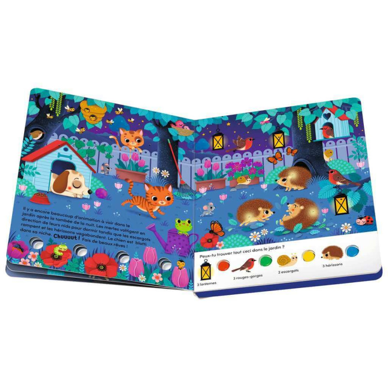 D'un simple appui, plus de 50 lumières révèlent les animaux cachés dans 4 univers nocturnes (ville, jardin, forêt, ferme)...