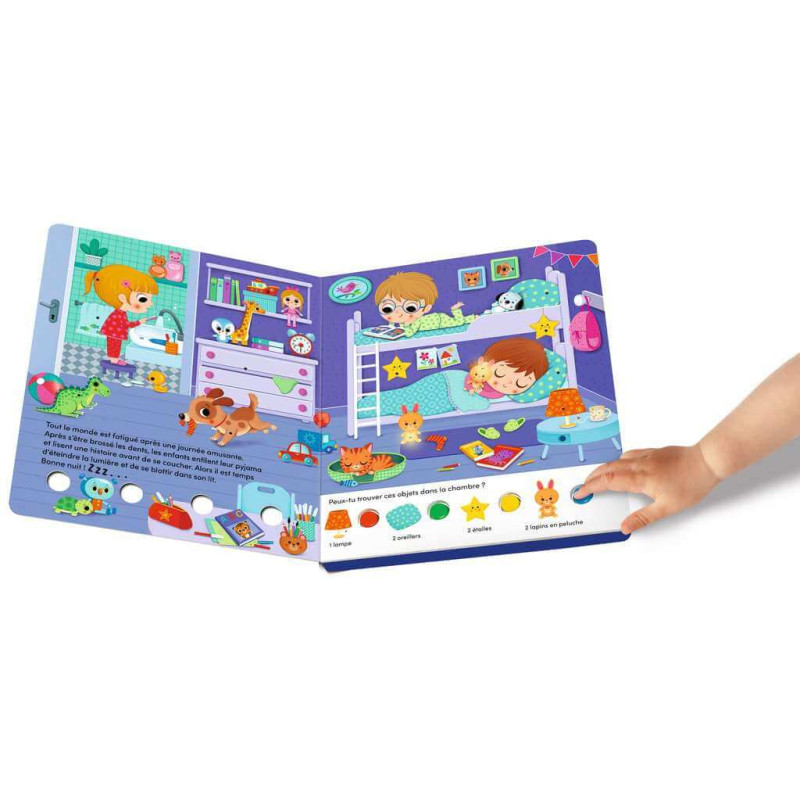 Dans ce livre Cherche et trouve , les plus petits découvrent le monde de nuit. Des boutons lumineux font apparaître différents éléments sur les pages. Un amusant jeu de Cherche et trouve avec des lumières !