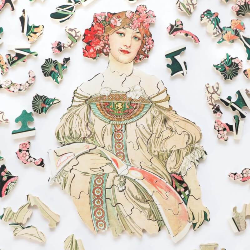 Après un début de carrière à Vienne, Alfons Mucha arrive à Paris en 1887. Il réalise cette lithographie pour le calendrier de l'imprimerie Champenois en 1898. Elle est typique de son style Art nouveau. La découpe de ce puzzle est guidée par la composition de l'oeuvre, toute en arabesques !